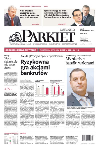 Przybywa spółek z problemami – ryzykowna gra akcjami bankrutów; Atlantis – miesiąc bez handlu walorami; zgoda na fuzję BZ WBK Mateusza Morawieckiego z Kredyt Bankiem Macieja Bardana jeszcze w tym roku; w III kwartale otoczenie makro okazało się znacznie lepsze niż sądzono; złoty słabnie, ale nie straci dużo.