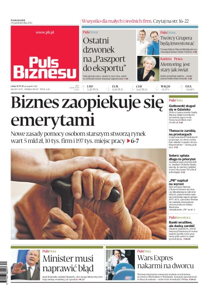 Biznes zaopiekuje się emerytami – nowe zasady pomocy osobom starszym stworzą rynek wart 5 mld zł, 10 tys. firm i 197 tys. miejsc pracy; dziś startuje trzeci, ostatni w tym roku, nabór na dofinansowanie ekspansji zagranicznej; Tomasz Dalach i Marcin Mikołajczyk uruchamiają fundusz Online Partners; Urząd Zamówień Publicznych proponuje, by oferty można było składać w języku obcym; zdaniem analityków, wśród instytucji finansowych można znaleźć perełki, które przyniosą zyski nawet w czasie spowolnienia; Jacek Rostowski, minister finansów, chce zacząć fakturową rewolucję miesiąc wcześniej, już 1 grudnia.
