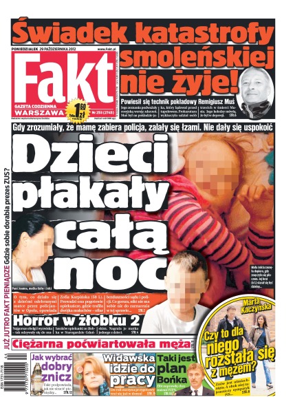 Świadek katastrofy smoleńskiej nie żyje – powiesił się technik pokładowy Remigiusz Muś; co działo się z dziećmi odebranymi matce przez policjantów w Opolu; ciężarna poćwiartowała męża; Marta Kaczyńska znów jest uśmiechnięta, a obok niej tajemniczy sympatyk PiS...; jak wybrać dobry znicz; Zibi naprawdę chce zmienić PZPN – poznaj plan Bońka.