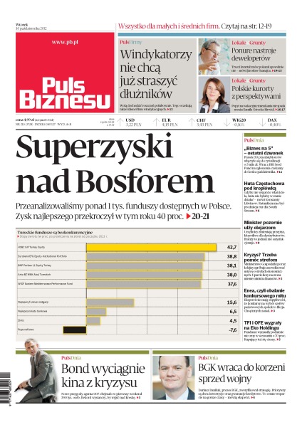 Windykatorzy nie chcą już straszyć dłużników – wolą dochodzić roszczeń polubownie; ponure nastroje deweloperów – trzeci kwartał znów pokazał spowolnienie; polskie kurorty z perspektywami – popyt na wakacyjne mieszkania nie spada; superzyski nad Bosforem – przeanalizowaliśmy ponad 1 tys. funduszy dostępnych w Polsce, zysk najlepszego przekroczył w tym roku 40 proc.; gdyby nie wsparcie właściciela, częstochowska huta nie byłaby w stanie działać.