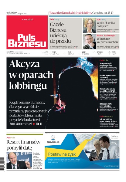Rząd niejasno tłumaczy, dlaczego wycofał się ze zmiany papierosowych podatków, która miała przynieść budżetowi 300-400 mln zł ; w ciągu czterech lat ponad 70 proc. firm weszło na nowe rynki lub rozszerzyło działalność; w spór firmy rodziny Dziewitów i banku wmieszała się policja – i ją sparaliżowała; rada bada, jak się kręci film na GPW; rewolucja w fakturach nastąpi 1 stycznia, nie 1 grudnia. Urzędnicy Jacka Rostowskiego posłali do Sejmu nie ten projekt.