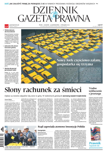 Nowy Jork częściowo zalany, ale gospodarka się trzyma; pod koniec września w urzędach pracy zarejestrowanych było 235,4 tys. bezrobotnych po studiach; samorządy wciąż muszą pokrywać koszty przygotowania posiłków dla przedszkolaków oraz utrzymania stołówek; opłaty za wywóz odpadów idą ostro w górę – w niektórych gminach wzrosną nawet trzykrotnie; elektrownia atomowa planowana przez PGE powstanie – państwo będzie wspierać ten projekt.