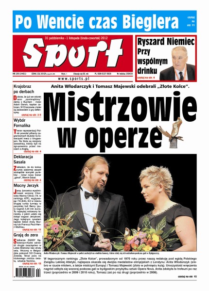 Mistrzowie w operze – Anita Włodarczyk i Tomasz Majewski odebrali „Złote Kolce”; dobrze, że już we wtorek rano „zamknęliśmy” derby z Ruchem - mówi Adam Danch, kapitan zabrzan, w Chorzowie z kolei są zadowoleni z gry defensywy; trener reprezentacji Polski powołał piłkarzy za-granicznych klubów na towarzyski mecz z Urugwajem; zakładam, że do końca rundy jesiennej zespół zdobędzie komplet punktów - mówi nowy trener „górali”, Marcin Sasal; siatkarze ZAKSY Kędzierzyn-Koźle odnieśli drugie zwycięstwo w Lidze Mistrzów bez straty seta.