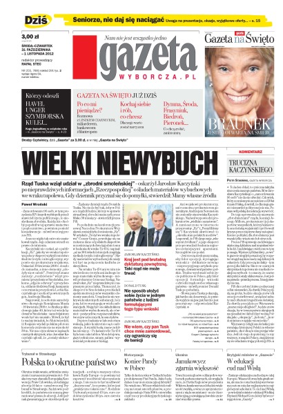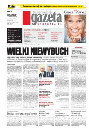 Rząd Tuska wziął udział w„zbrodni smoleńskiej”– oskarżył Jarosław Kaczyński po nieprawdziwych informacjach „Rzeczpospolitej”; Polska trzy razy złamała Europejską Konwencję Praw Człowieka, utrudniając aborcję 14-latce – uznał wczoraj Trybunał w Strasburgu; tylko do końca roku w Tychach będzie produkowany Fiat Panda – jakie będą dalsze losy motoryzacyjnej fabryki; wyglądana to, że Partia Regionów prezydenta Wiktora Janukowycza zdobędzie większość zwykłą, a wraz ze sprzymierzonymi z nią komunistami – może i konstytucyjną; seniorze, nie daj się naciągać – uwaga na prezentacje, okazje, wyjątkowe oferty.