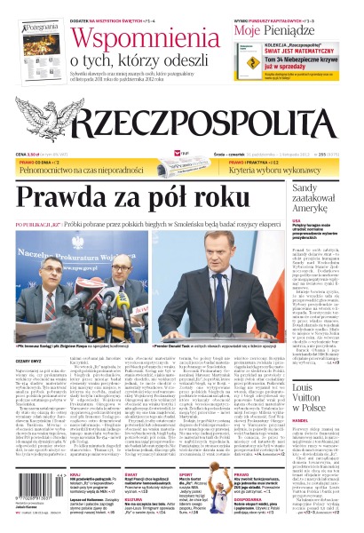 Prawda za pół roku – próbki pobrane przez polskich biegłych w Smoleńsku będą badać rosyjscy eksperci; pełnomocnictwo na czas nieporadności; kryteria wyboru wykonawcy; USA – potężny huragan może utrudnić normalne przeprowadzenie wyborów prezydenckich; rząd Francji chce legalizacji małżeństw homoseksualnych; sylwetki sławnych oraz mniej znanych osób, które pożegnaliśmy od listopada 2011 roku do października 2012 roku.