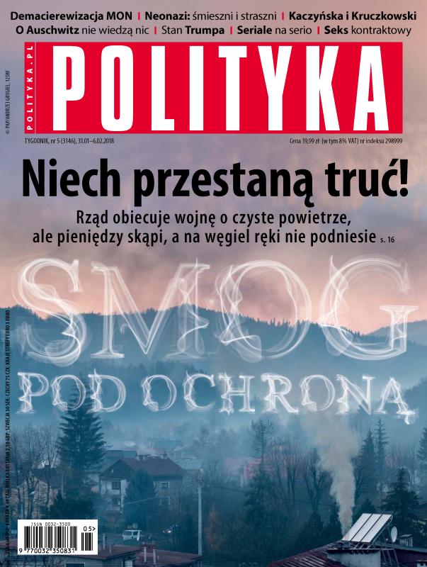 Smog pod ochroną: rząd obiecuje wojnę o czyste powietrze, ale pieniędzy skąpi, a na węgiel ręki nie podniesie; MON po Macierewiczu; dr hab. Mikołaj Rakusa-Suszczewski o śmieszno-strasznych nazistowskich radykałach i przyzwoleniu na neofaszyzm; Leon Kruczkowski: wymazywany przez PiS, opisywany przez Jadwigę Kaczyńską; trudne pytania o Auschwitz – czego nie wiedzą uczniowie; rok Trumpa: więcej farsy niż tragedii; serialowe rozliczenie z historią; Szwecja: umowa na seks; Dorota Kobiela, nominowana do Oscara reżyserka animacji „Twój Vincent”, na razie nie chce pracować poza Polską, nawet w Hollywood; fotoreportaż: nadzieja w somalijskim piekle.