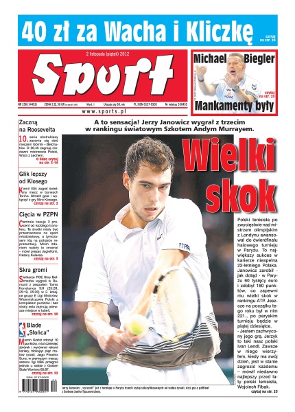 Jerzy Janowicz wygrał z trzecim w rankingu światowym Szkotem Andym Murrayem; 10. seria ekstraklasy zacznie się dziś meczem Górnik – Bełchatów; Kamil Glik zagrał świetny mecz w barwach Torino, strzelił gola i wyłączył z gry Miro Klosego; siatkarze PGE Skry Bełchatów wygrali w Rumunii z zespołem Tomis Konstanca 3:0; Marcin Gortat zdobył 10 punktów i miał dziewięć zbiórek – wyrównał rekord kariery.