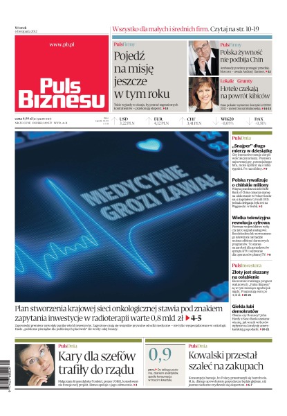 Wizyta przedstawicieli EXIM Bank of China oznacza szansę na ulokowanie w Polsce funduszu z kapitałem 0,5 mld USD.; plan stworzenia krajowej sieci onkologicznej stawia pod znakiem zapytania inwestycje w radioterapii warte 0,8 mld zł; City Interactive testuje cierpliwość akcjonariuszy; pierwsze województwo wyłączy jutro sygnał analogowy – bez dekodera lub nowoczesnego telewizora nie będzie można odbierać darmowych programów; czy złoty jest skazany na osłabienie; John Hardy z Saxo Banku zastanawia się, jak wynik wyborów wpłynie na kondycję amerykańskiej gospodarki; konsumpcja hamuje, bo Polacy przestraszyli się bezrobocia – m.in. dlatego spowolnienie gospodarcze będzie głębsze, niż jeszcze niedawno wydawało się ekspertom.