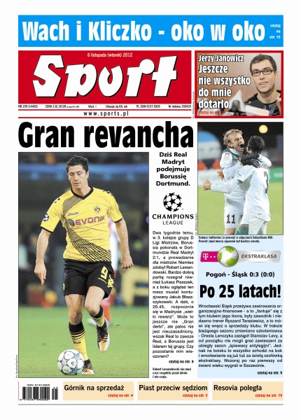 Dziś Real Madryt podejmuje Borussię Dortmund; o pół miliona złotych „siłują się” władze Śląska Wrocław z Ryszardem Tarasiewiczem; starcie Rzymu z Sycylią wyszło na remis – Roma rozgromiła Palermo 4:1, a Catania zdeklasowała Lazio 4:0; potencjał Jastrzębskiego Węgla predestynuje nas do walki o złoto – przekonuje prezes tego klubu; mecze z Holandią i Ukrainą pokazały, że biało-czerwoni pod wodzą Michaela Bieglera trzymają średniaków na dystans – jak zaprezentują się na tle elity, przekonamy się w styczniu, podczas mistrzostw świata; Mariusz Wach i Władimir Kliczko ponad minutę patrzyli sobie w oczy w czasie dla fotoreporterów po konferencji prasowej.