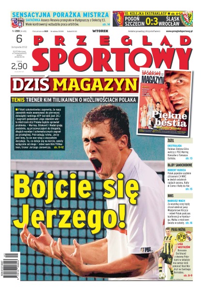 Dopiero na dziewięć dni przed meczem z Urugwajem podjęto decyzję o wymianie murawy na PGE Arenie; czy Robert Lewandowski i Łukasz Piszczek pójdą w ślady Jana Urbana; bohater turnieju w Paryżu przyleciał do Polski jako 26. tenisista świata; już tylko dwa kluby liczą się w wyścigu po Tomasza Golloba; mistrzowie Polski z Asseco Resovii przegrali 1:3 w Bydgoszczy z Delectą, choć rywale byli osłabieni, a podstawowy rozgrywający Michal Masny miał gorączkę; w listopadzie Robert Kubica wystartuje w dwóch rajdach za kierownicą szybkiego Citroena C4 WRC; remis – to wynik „starcia” Mariusza Wacha z Władymirem Kliczką na ostatniej przed sobotnim pojedynkiem konferencji prasowej.