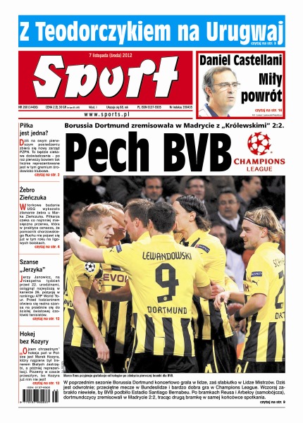 Borussia Dortmund zremisowała w Madrycie z „Królewskimi” 2:2; dziś na swym pierwszym posiedzeniu zbiera się nowy zarząd; Celtic dzieliły sekundy od remisu na Camp Nou – w rewanżu z Barceloną na własnym boisku może być mu znacznie trudniej; przed Jerzym Janowiczem otwierają się realne perspektywy na przebicie się do ścisłej światowej czołówki; 12 punktów i 13 zbiórek Marcina Gortata nie wystarczyło na Miami Heat – mistrzowie NBA rozbili Phoenix Suns 124:99; mało kto wie, że Mariusz Wach jako amator boksował w tym samym klubie co Władimir Kliczko, w Gwardii Warszawa.