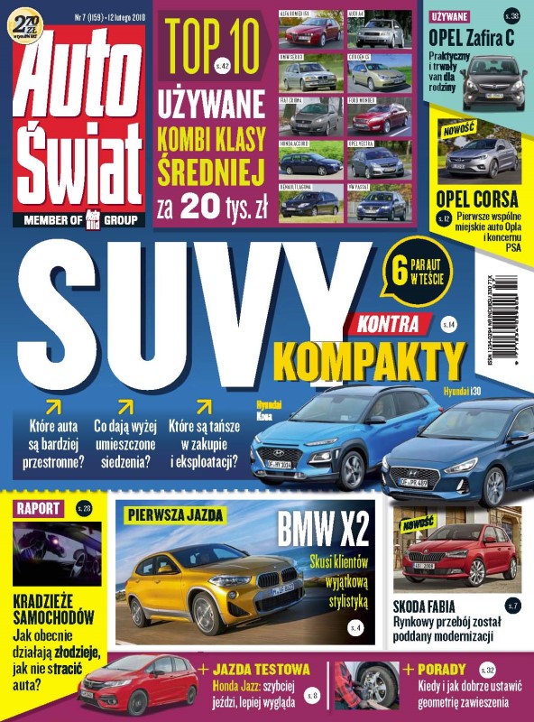 BMW X2 – wrażenia z jazd ładniejszą odmianą SUV-a X1; Skoda Fabia – model po modernizacji; Hondy: Jazz i Civic – pierwsze jazdy Jazzem po face liftingu i Civikiem w wersji dieslowskiej; Raport: Volkswagen po Dieselgate – co się zmieniło w koncernie po największym skandalu w jego historii; kompakty kontra crossovery – porównanie 6 par modeli Audi, Citroëna, Hyundaia, Mazdy, Renault i Volkswagena; Volvo V90 – luksusowe kombi z dieslem i napędem 4x4; Porsche Cayenne S – nowa generacja SUV-a w wersji z mocnym benzyniakiem biturbo.