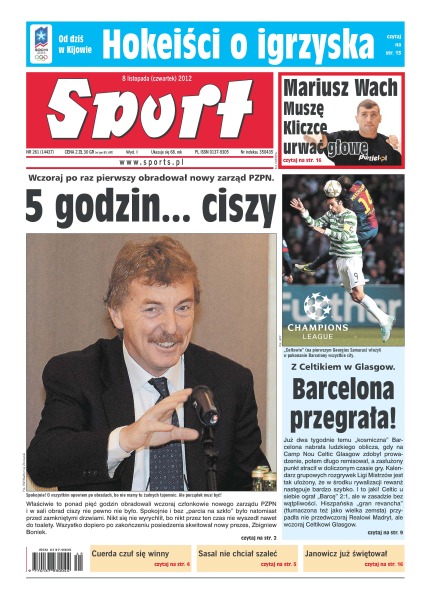 Wczoraj po raz pierwszy obradował nowy zarząd PZPN; klubem z Bukowej nadal kierować będzie Wojciech Cygan – ale wciąż w randze wiceprezesa; Jose Mourinho pochwalił polskich piłkarzy – niemieckie media wyżej oceniają występ Łukasza Piszczka niż Roberta Lewandowskiego; na Celtic Park Messi miał strzelić gola z dedykacją dla syna, cel osiągnął, ale Barcelona doznała pierwszej porażki w rozgrywkach; środowisko PlusLigi broni pomysłu „zamknięcia” rozgrywek, nazywając go „otwarciem” ligi, które korzystnie wpływa na rozwój siatkówki w Polsce; rodzinne miasto Jerzego Janowicza już rozpoczęło świętowanie 22. urodzin nowej gwiazdy kortów; Mariusz Wach zapowiadał – żartem oczywiście – że będzie musiał „urwać” głowę rywalowi, żeby odebrać mu w sobotę mistrzowskie pasy.