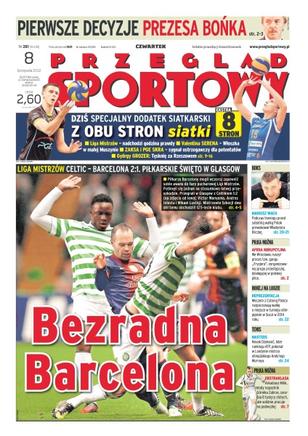 Zarząd piłkarskiej centrali jest po pierwszym posiedzeniu – spektakularnych decyzji zabrakło, ale było profesjonalniej; duma Katalonii pierwszy raz przegrała w tym sezonie z kimś innym niż Real – Celtic uczcił jubileusz 125-lecia; trener Realu Madryt odniósł się do transferowych plotek dotyczących Lewandowskiego i Piszczka; po ligowym falstarcie Asseco Resovia i PGE Skra Bełchatów potrzebują punktów, by znaleźć się w czołowej czwórce na półmetku fazy zasadniczej rozgrywek; podczas treningu przed walką Kliczko – Wach poza ringiem wylądowała rękawica z podobizną mistrza świata; Novak Dżoković pokonał Andy’ego Murraya 4:6, 6:3, 7:5.