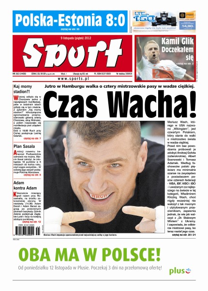 Jeszcze nigdy Władimir Kliczko nie walczył z tak wysokim rywalem, jakim będzie w sobotę w Hamburgu Mariusz Wach, ale i tak jest zgodnej opinii zdecydowanym faworytem.; Tomasz Frankowski przed rozpoczęciem bieżącego sezonu planował wyprzedzenie Gerarda Cieślika na liście najlepszych snajperów wszech czasów ekstraklasy; trzy drużyny mają już zapewniony awans do 1/8 finału – byli triumfatorzy Ligi Mistrzów Manchester United i FC Porto oraz debiutant z Hiszpanii; jastrzębianie po wielkim zwycięstwie nad Skrą Bełchatów teraz spróbują wygrać w Kędzierzynie-Koźlu, jako pierwsi w tym sezonie; Justyna Kowalczyk w fińskim Muonio, gdzie już jest piękna zima, rozpoczęła ostatni etap przygotowań przed zbliżającym się sezonem.