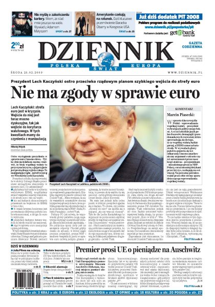Lech Kaczyński jest przeciwny rządowym planom szybkiego wejścia do strefy euro; premier prosi UE o pieniądze na Auschwitz; Tusk zażąda od Brukseli stosowania równego prawa wobec wszystkich państw UE; Paweł Graś od wczoraj jest nowym rzecznikiem rządu; Polska ma plan awaryjny na Euro 2012; minister Pitera i jej auto mają specjalną obstawę policjantów; rozmowa z prof. Jackiem Łuczakiem; Komisja Europejska chce przejąć od rządów nadzór nad instytucjami finansowymi; Amerykanie wierzą w plan ratunkowy Obamy. Dodatki: The Wall Street Journal, Warszawa, PIT 2008.