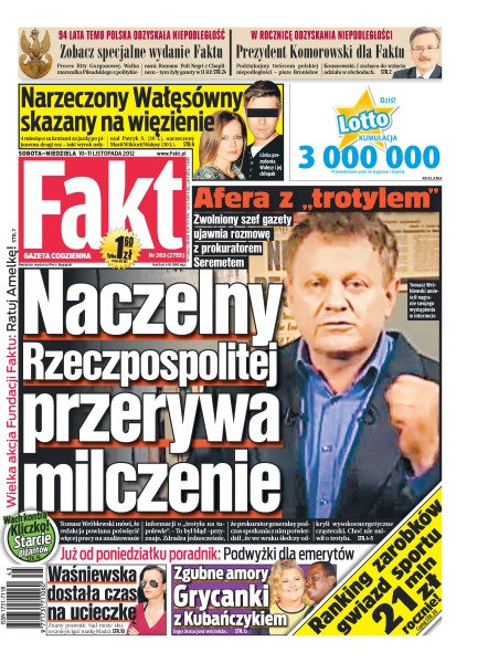 Naczelny Rzeczpospolitej przerywa milczenie; córka byłego prezydenta przysparza kłopotów schorowanemu ojcu; czy sąd dał czas Katarzynie Waśniewskiej na ucieczkę; pracownik krakowskiego Uniwersytetu Rolniczego targnął się na życie; Sylvester Stallone przylatuje do Hamburga na walkę Mariusza Wacha z ukraińskim mistrzem; 21 milionów złotych – Marcin Gortat zarabia najwięcej; w styczniowym Rajdzie Dakar Adam Małysz pojedzie Toyota, która będzie mógł rywalizować z najlepszymi.