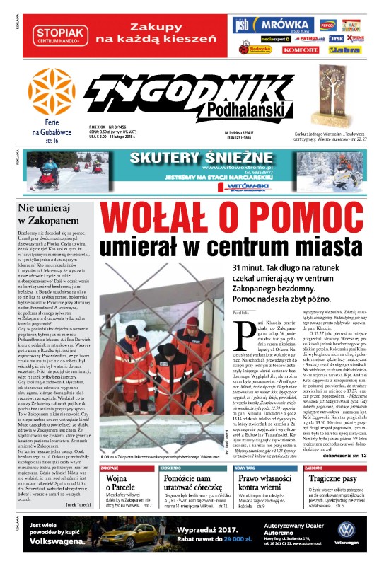 31 minut – tak długo na ratunek czekał umierający w centrum Zakopanego bezdomny – pomoc nadeszła zbyt późno; mieszkańcy willowej dzielnicy w Zakopanem nie chcą żyć na Wawelu; diagnoza była bezlitosna – guz móżdżku AT/RT. – świat nam się zawalił – mówi mama 14-miesięcznej Wiktorii; w rodzinnym domu księdza Mariana zagrodzili drogę do kościoła; o życie walczy kobieta potrącona na źle oznakowanym przejściu dla pieszych – dlaczego dyrekcja dróg nie zmieni oznakowania.