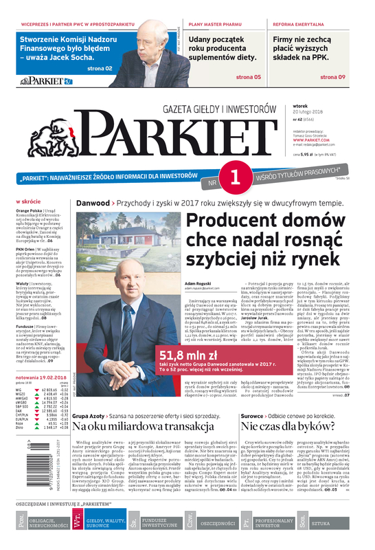 Największy w Polsce newsroom gospodarczy zbiera, analizuje i zgłębia dla Państwa najważniejsze informacje ze świata finansów. Codzienne wydanie „Parkietu”, sześć dni w tygodniu, to kilkadziesiąt artykułów o emitentach, instytucjach finansowych, gospodarce. To również opinie, felietony i wywiady z najważniejszymi ludźmi krajowej i globalnej finansjery.