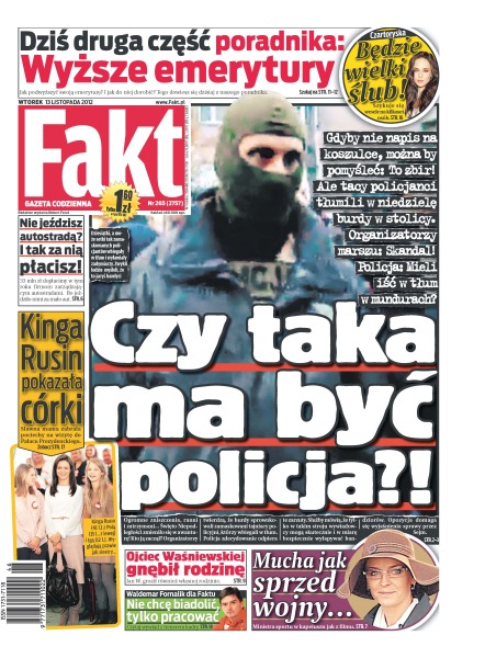 Wielu uczestników marszu niepodległości skarży się na działania służb – policja się broni przed zarzutami; Putin chce Rosjanom zabrać internet; Kamiński, Libiccy, Giertych, Olejniczak i Kalisz lansowali się na marszu; ministra sportu wystąpiła w najmodniejszym kapeluszu; Jacek F. zaczaił się w polu na dzika – gdy wyszedł na ścieżkę Mariusz Niżnik, wystrzelił z karabinu; Anna Czartoryska musi zmienić plany; selekcjoner reprezentacji Polski Waldemar Fornalik przed meczem z Urugwajem zapewnia, że nie narzekałby, gdyby nie udało się wymienić trawy w Gdańsku; modelki kręcą gwiazdy Górnika.