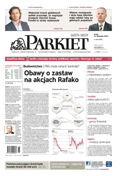 Spółki na potęgę zmieniają daty publikacji sprawozdań finansowych – inwestorzy, którzy na tej podstawie podejmują decyzję, mogą potem żałować; wierzyciele są zaniepokojeni zastawem na akcjach Rafako; przychody Tauronu za trzy kwartały 2012 r. wyniosły 18,2 mld zł i były o 20 proc. wyższe niż rok temu; Wiśniewski może przejąć IGroup dla podatkowej tarczy; mennicę napędza handel złotem; Asseco stawia na dywersyfikację; Eurogrupa zamraża problem długu Grecji.