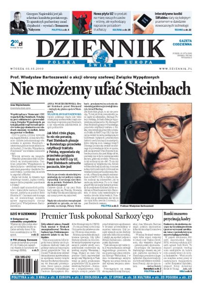 Nie możemy ufać Steinbach - mówi prof. Bartoszewski; Tomasz Nałęcz o zablokowaniu powstania wspólnej listy lewicy w eurowyborach; Jarosław Kaczyński uważa, że premier niczego nie osiągnął w Brukseli; szczyt Unii pokazał, że podziały są głębokie, a lekarstwa na kryzys na razie nie ma; banki rozpoczęły przycinanie kadr; internauci poszukują esperalu; brytyjskie służby socjalne coraz częściej odbierają polskim rodzicom dzieci. Dodatki: The Wall Street Journal, Warszawa, Nieruchomości.