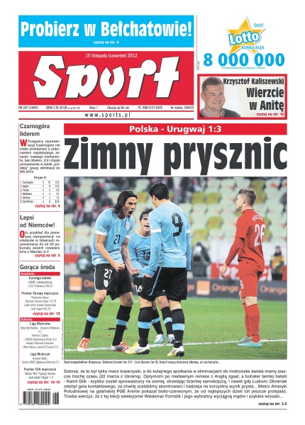 Dawno nikt nie dał reprezentacji tak dobrej i bolesnej lekcji futbolu, jak wczoraj Urugwaj – 1:3 z czwartą drużyną świata to dla Polaków najmniejszy wymiar kary; fantastyczny występ Zlatana Ibrahimovicia – dzięki jego czterem bramkom Szwecja pokonała Anglię; po niespełna dwóch miesiącach w Katarze do Polski wrócił Mariusz Jurasik; Maja Włoszczowska nie może jeszcze biegać, ale już jeździ na rowerze szosowym; koszykarki z Polkowic przegrały w Jekaterynburgu z miejscowym