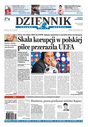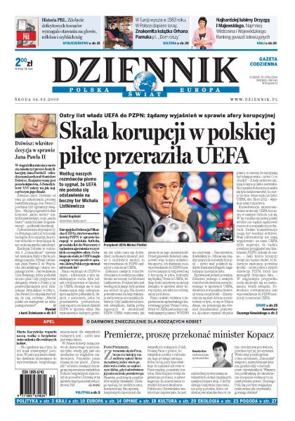 UEFA żąda od PZPN wyjaśnień w sprawie afery korupcyjnej; posłanki lewicy, prawicy i feministki wspólnie apelują o darmowe znieczulenia dla rodzących; o kanonizacji Jana Pawła II - wywiad z kardynałem Stanisławem Dziwiszem; rząd Tuska podtrzymuje sprzeciw wobec nominacji szefowej wypędzonych do władz fundacji Pojednanie; amerykańska prasa pisze o końcu tarczy w Polsce; badanie CBOS: recesja jest odczuwalna w co czwartym polskim domu; Węgry znalazły się na skraju bankructwa; terroryści zaatakowali w Pakistanie drużynę krykiecistów Sri Lanki, co najmniej osiem osób nie żyje. Dodatki: The Wall Street Journal, Warszawa.