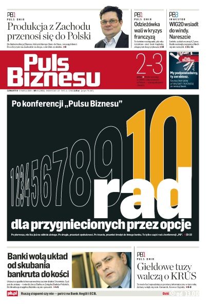 10 ważnych porad dla obciążonych toksycznymi derywatami walutowymi, banki nakłaniają do nowelizacji ustawy, która wejdzie w życie pod koniec marca, Asseco, Comarch i Sygnity walczą o system IT dla KRUS-u, Ford broni się przed kryzysem, odzieżowa franczyza sposobem na trudne czasy, wciąż nie jest jasna przyszłość Sfinksa, prezes TV Puls dementuje plotki wokół inwestycji w firmę, WIG20 wzrósł o 4,23% – powracają gracze z zagranicy.
