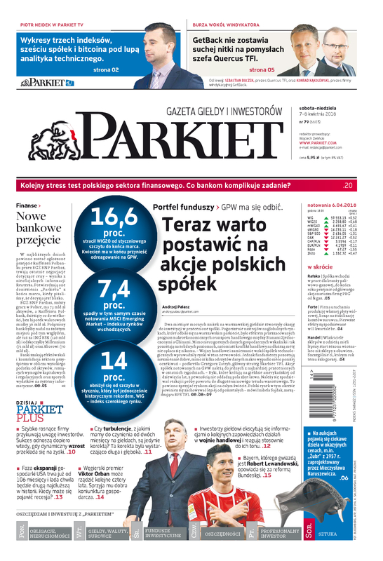 Największy w Polsce newsroom gospodarczy zbiera, analizuje i zgłębia dla Państwa najważniejsze informacje ze świata finansów. Codzienne wydanie „Parkietu”, sześć dni w tygodniu, to kilkadziesiąt artykułów o emitentach, instytucjach finansowych, gospodarce. To również opinie, felietony i wywiady z najważniejszymi ludźmi krajowej i globalnej finansjery.