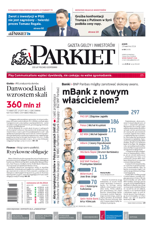 Największy w Polsce newsroom gospodarczy zbiera, analizuje i zgłębia dla Państwa najważniejsze informacje ze świata finansów. Codzienne wydanie „Parkietu”, sześć dni w tygodniu, to kilkadziesiąt artykułów o emitentach, instytucjach finansowych, gospodarce. To również opinie, felietony i wywiady z najważniejszymi ludźmi krajowej i globalnej finansjery.
