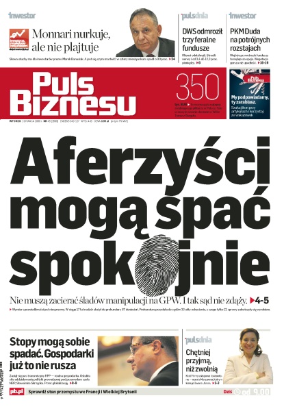 Barometr Manpowera: praca będzie w budownictwie, a zwolnienia w firmach produkcyjnych, prokuratury i sądy nie radzą sobie z manipulacjami na GPW, trzy fundusze DWS odzyskały płynność, rynki finansowe przestały się przejmować stopami procentowymi, Nafta Polska ma zniknąć do połowy 2010 roku, Tomasz Morawski nowym prezesem Sfinksa, kolejny kwartał spadków na rynku hipotek, trzy scenariusze dla PKM Duda, udana sesja GPW zakończona spadkiem o 1,4%, kurs akcji Monari od listopada spadł o 90%.