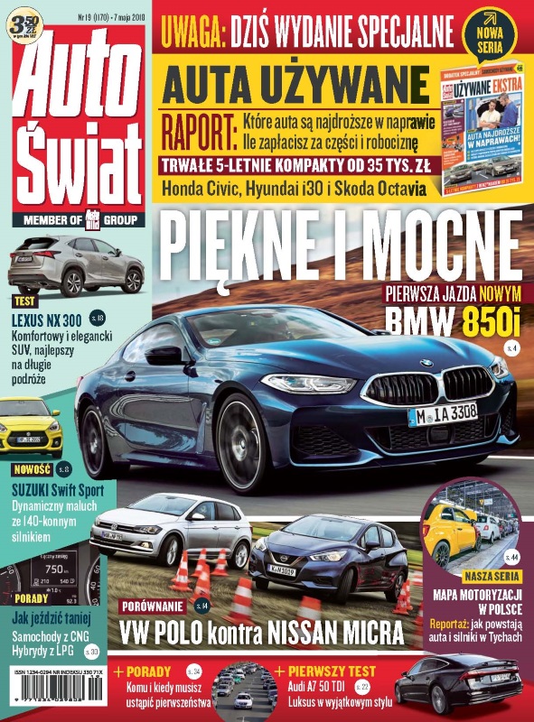 AKTUALNOŚCI: BMW serii 8; Hyundai i20; Suzuki Swift Sport; Mercedes klasy G; TESTY: Nissan Micra kontra VW Polo; Lexus NX 300; BMW i3s; Audi A7; Porsche 718 Boxster; Volvo XC60; Mitsubishi Space Star; PORADY: inne zasilanie gazem - LPG w hybrydzie i gaz ziemny; pierwszeństwo w ruchu drogowym; porady miks; FASCYNACJE: Ferrari 488 Pista; youngtimer - Suzuki Vitara (1988-98); REPORTAŻ: motoryzacyjna mapa Polski - Tychy; DODATEK SPECJALNY - SAMOCHODY UŻYWANE.