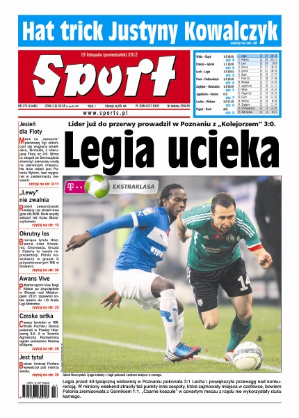Lech – Legia 1:3 – Legia zadała trzy nokautujące ciosy i najlepsza obrona w ekstraklasie posypała się jak domek z kart; hat trick Justyny Kowalczyk; Robert Lewandowski kolejny raz strzelił dwa gole dla BVB, dwie asysty zaliczył też Kuba Błaszczykowski; piłkarze ręczni Vive Targi Kielce po zwycięstwie w Skopje nad Metalurgiem 23:21 zapewnili sobie awans do 1/8 finału Ligi Mistrzów; czescy tenisiści w 100. finale Pucharu Davisa pokonali w Pradze Hiszpanię 3:2.