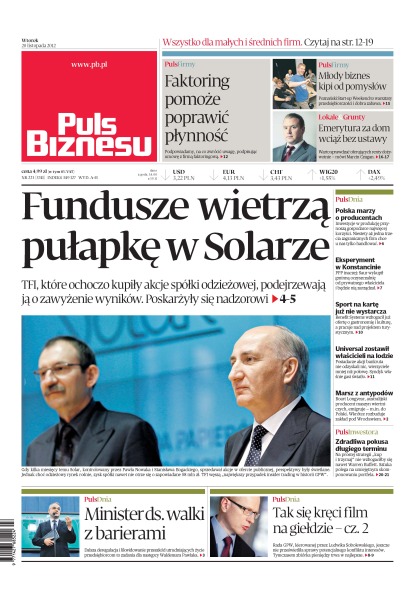 Faktoring pomoże poprawić płynność – na co zwrócić uwagę, podpisując umowę z firmą faktoringową; młody biznes kipi od pomysłów – poznański Start-up Weekend to warsztaty przedsiębiorczości i dobra zabawa; emerytura za dom wciąż bez ustawy – warto sprawdzać oferujących renty dożywotnie; fundusze wietrzą pułapkę w Solarze – TFI, które ochoczo kupiły akcje spółki odzieżowej, podejrzewają ją o zawyżenie wyników.