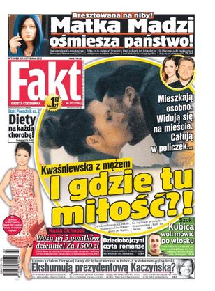 Sąd zdecydował o aresztowaniu Katarzyny Waśniewskiej, tylko co to zmienia, przecież podejrzana o zabicie Madzi kobieta zniknęła już 5 tygodni temu; Kwaśniewska z mężem mieszkają osobno, widują się na mieście i całują w policzek – i gdzie tu miłość; Kasia Cichopek dostaje pięć posiłków dziennie za 1500 zł; Robert Kubica woli mówić po włosku; czy ekshumują prezydentową Kaczyńską.