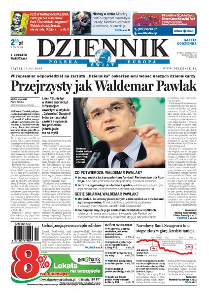 Pod presją premiera Waldemar Pawlak musiał odpowiedzieć na zarzuty w sprawie jego biznesowych powiązań; PO, PSL i SLD przedstawiły projekt nowej ustawy medialnej; Leszek Borkowski twierdzi, że stracił posadę, bo odmówił rejestracji leku Detralex firmy Servier; dziś w Warszawie odbędzie się pogrzeb słynnego kardiochirurga prof. Zbigniewa Religi; według niemieckiej prasy, masakry w szkole w Winnenden można było uniknąć; ruszył proces Bernarda Madoffa, oskarżonego o sprzeniewierzenie 65 mld dolarów.