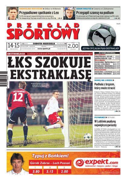 Leo Beenhakker podał skład reprezentacji Polski na najbliższe mecze o punkty w eliminacjach do MŚ 2010; w ostatnim meczu pod okiem trenera Jacka Zielińskiego ŁKS Łódź pokonał Polonię Warszawa 3:1; Legia Warszawa przegrała z Jagiellonią Białystok 1:2; Zygmunt Solorz zaczyna inwestować duże pieniądze w Śląsk Wrocław; Adam Małysz zajął czwarte miejsce w konkursie PŚ w Lillehammer; wywiad z Przemysławem Stańczykiem, pływackim mistrzem świata na 800 metrów kraulem; jeżeli Manchester United pokona FC Liverpool to będzie miał duże szanse na obronę tytułu mistrza Anglii.