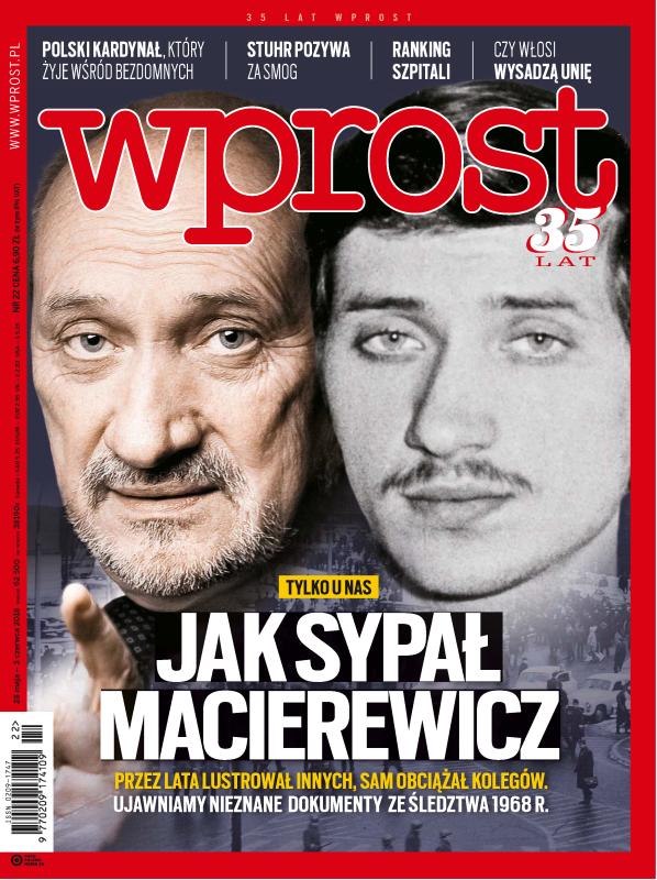 Jak sypał Macierewicz: przez lata lustrował innych, sam obciążał kolegów - ujawniamy nieznane dokumenty ze śledztwa 1968 r.; polski kardynał, który żyje wśród bezdomnych; mieszkańcy wygrywają z miastami procesy o smog, tym razem pozew złożyło kilkudziesięciu aktorów i celebrytów, wśród nich Jerzy Stuhr; ranking szpitali: laryngologia i ortopedia; Tusk na prezydenta – nawołuje Rafał Grupiński; Adam Hofman i jego gabinet; za co nienawidzono Bema; ruszyła winda na literacki szczyt – Booker dla Olgi Tokarczuk; rodzina niczym gang – rozmowa z Hirokazu Koreedą.