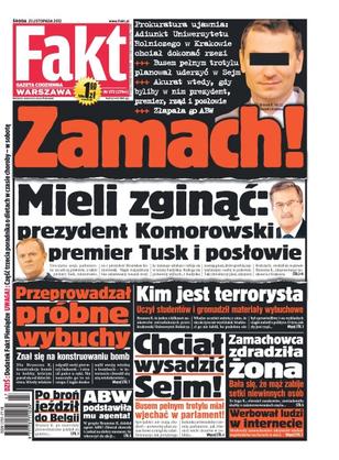 Prezydent Komorowski premier Tusk i posłowie mieli zginąć w zamachu terrorystycznym – poznaj wszystkie szczegóły misternie przygotowanego planu; Kwaśniewska i Badach – czy kariera jest ważniejsza od żony; Doda poluje na nowe porsche; Kasia Figura boi się oddać dzieci mężowi; dzisiaj wyrok na PZPN; piłkarze Legii tuż przed meczem z Lechem otrzymali zaległe pensje i wygrali spotkanie.