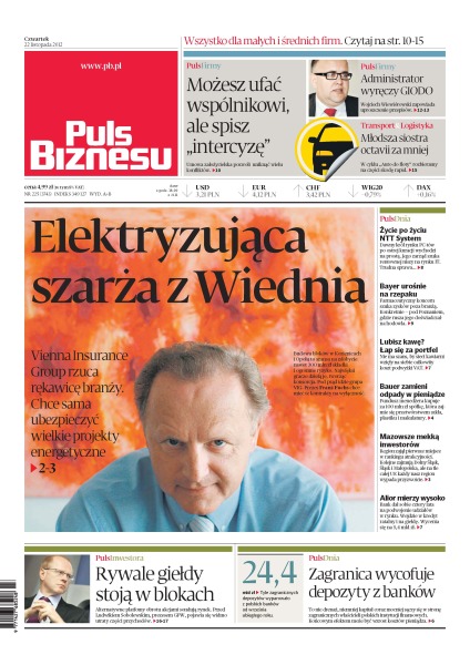Możesz ufać wspólnikowi, ale spisz „intercyzę” – umowa założycielska pozwoli uniknąć wielu konfliktów; administrator wyręczy GIODO – Wojciech Wiewiórowski zapowiada uproszczenie przepisów; elektryzująca szarża z Wiednia – Vienna Insurance Group rzuca rękawicę branży, chce sama ubezpieczyć wielkie projekty energetyczne; lubisz kawę – łap się za portfel.