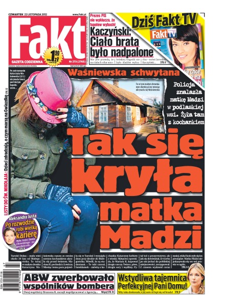Policja znalazła matkę Madzi w podlaskiej wsi, kobieta żyła tam z kochankiem; prezes PiS nie wyklucza, że tupolew wybuchł i dodaje: „ciało brata było nadpalone”; Aleksandra Justa po rozwodzie robi wielką karierę; ABW zwerbowało wspólników bombera; wstydliwa tajemnica Perfekcyjnej Pani Domu.