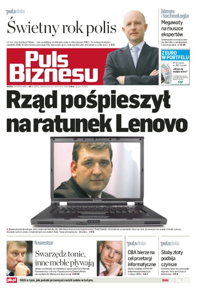 2008 był rekordowym rokiem polis ubezpieczeniowych – wzrost względem poprzedniego roku wyniósł 36%, Lenovo dostanie wyższy grant, bo zbankrutował budujący mu halę deweloper, CBA zaczyna szperać w kontraktach informatycznych PKO BP, najemcy sklepów w centrach handlowych proszą o niższe czynsze, Dom Bank na serio ruszył z akcją kredytową, Niemcy są blisko dna i być może w II kw. odbiją się od niego, elektroniczne faktury dają kolosalne oszczędności, rynek nie wystraszył się likwidacji Swarzędza.