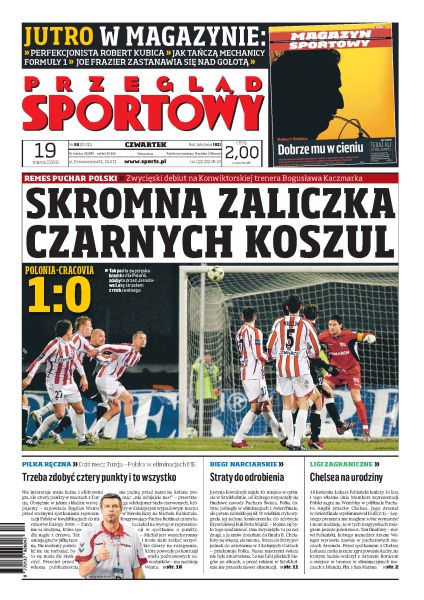 Wywiad z Łukaszem Fabiańskim, bramkarzem Arsenalu Londyn; w 1/4 Remes Pucharu Polski Polonia Warszawa wygrała z Cracovią 1:0; rozmowa z Jarosławem Latą, piłkarzem warszawskiej Polonii; Justyna Kowalczyk zajęła dziesiąte miejsce w sprincie techniką klasyczną podczas zawodów w Sztokholmie; rozmowa z Bogdanem Wentą; już jutro w meczu na szczycie Ekstraklasy Legia zagra z Górnikiem, która z drużyn ma lepszego bramkarza.