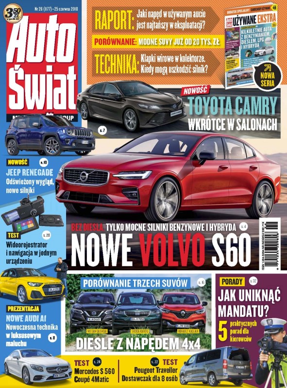 Nowe Volvo S60 – nowość ze Szwecji produkowana w USA; Toyota Camry – japońska limuzyna rusza na podbój Europy; Audi A1 – komfortowy i nowoczesny maluch; Jeep Renegade – wrażenia z jazd autem po face liftingu; Skoda Karoq kontra Nissan Qashqai i Renault Kadjar – porównanie kompaktowych SUV-ów z silnikami Diesla i napędem 4x4; Peugeot Traveller BlueHDi 150 – dostawczak na rodzinne podróże; Mercedes S 560 Coupé 4Matic – luksus w sportowym wydaniu; Ford Mondeo Kombi w wersji Vignale.