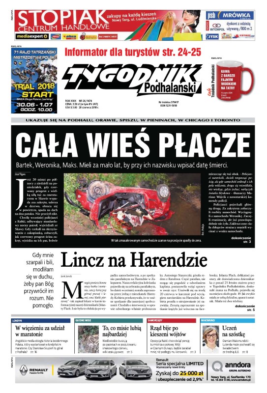 Całą wieś płacze – Bartek, Weronika, Maks, mieli za mało lat, by przy ich nazwisku wpisać datę śmierci; lincz na Harendzie – gdy mnie szarpali i bili, modliłam się w duchu, żeby pan Bóg przywrócił im rozum. Nie pomogło; w więzieniu za udział w maratonie; niedźwiedzie buszują po pasiekach w poszukiwaniu smakowitego czerwiu, wilki atakują owce; opozycja Rabki chce obciąć pensję burmistrza o połowę, wójt w Czarnym Dunajcu będzie zarabiał mniej niż podległy mu kierownik; Damian Waksmundzki-Luberda może pochwalić się świadectwem ze średnią 6,0.