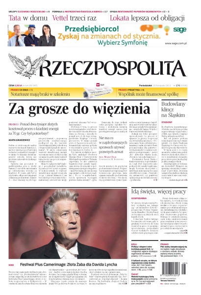 Za grosze do więzienia – ponad dwa tysiące złotych kosztował proces o kradzież energii za 70 gr., czy był potrzebny; budowlany klincz na Śląskim – rozbudowa legendarnego obiektu utknęła na dobre; notariusze mają braki w szkoleniu; wspólnik może finansować spółkę; w okresie świątecznym Polacy wydadzą na zakupy 24–25 miliardów złotych; o kulisach szczytu, na którym negocjowano unijny budżet; Festiwal Plus Camerimage: Złota Żaba dla Davida Lyncha.