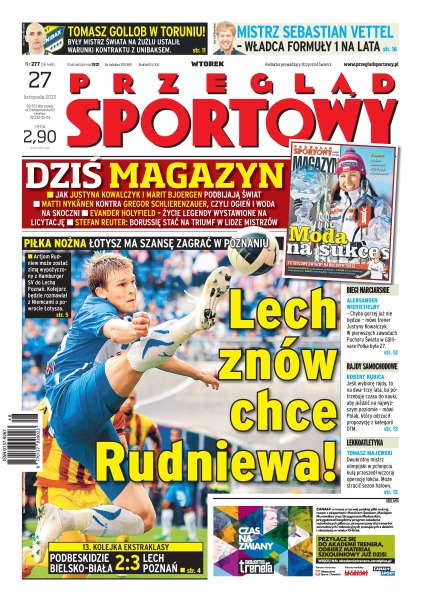 Artjom Rudniew może zostać zimą wypożyczony z Hamburger SV do Lecha Poznań; „chyba gorzej już nie będzie” – mówi trener Justyny Kowalczyk, która w pierwszych zawodach Pucharu Świata w Gällivare była 27.; „jeśli wybiorę rajdy, to na dwa–trzy lata, bo potrzebuję czasu do nauki, aby jeździć na najwyższym poziomie” – mówi Robert Kubica; Tomasz Majewski, dwukrotny mistrz olimpijski w pchnięciu kulą przeszedł wczoraj operację łokcia.