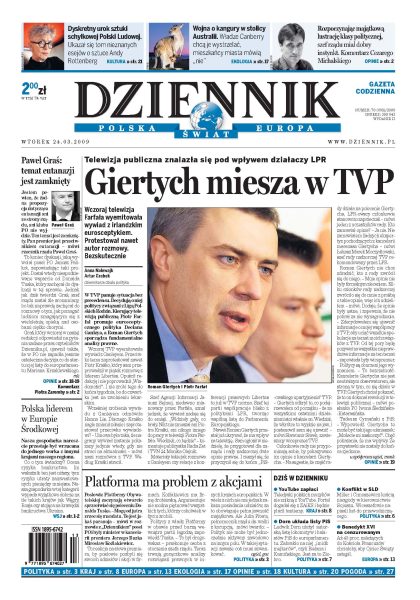 Telewizja publiczna znalazła się pod wpływem działaczy LPR; temat eutanazji jest zamknięty - mówi Paweł Graś; niektórzy posłowie nie chcą się pozbyć akcji i udziałów w spółkach, czego domaga się premier; Piekarska i Szmajdziński krytykują Napieralskiego; Ludwik Dorn na blogu zrecenzował kandydatów PiS do europarlamentu; rośnie niechęć wobec polityki Benedykta XVI; YouTube zapłaci ZAiKS tantiemy za odtwarzanie teledysków polskich wykonawców; władze Canberry chcą wystrzelać część żyjących w mieście kangurów olbrzymich, mieszkańcy protestują. Dodatki: The Wall Street Journal, Warszawa, Nieruchomości.