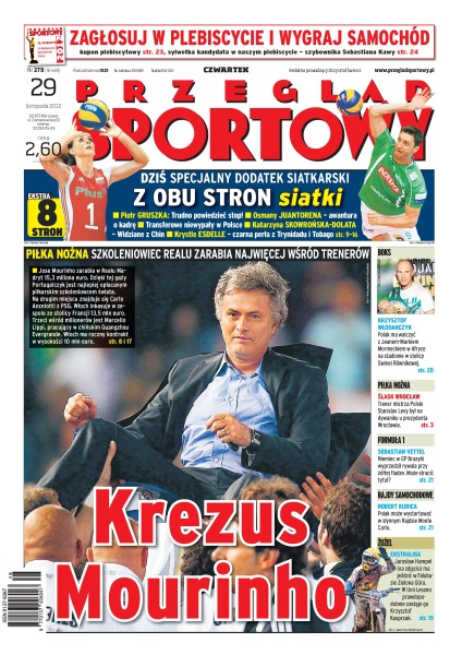 Jose Mourinho zarabia w Realu Madryt 15,3 miliona euro, dzięki tej gaży Portugalczyk jest najlepiej opłacanym piłkarskim szkoleniowcem świata; trener mistrza Polski Stanislav Levy był na dywaniku u prezydenta Wrocławia; Sebastian Vettel w GP Brazylii wyprzedził rywala przy żółtej fladze, czy może stracić tytuł; Robert Kubica może wystartować w słynnym Rajdzie Monte Carlo; Jarosław Hampel ma jeździć w Falubazie Zielona Góra, w Unii Leszno prawdopodobnie zastąpi go Krzysztof Kasprzak.